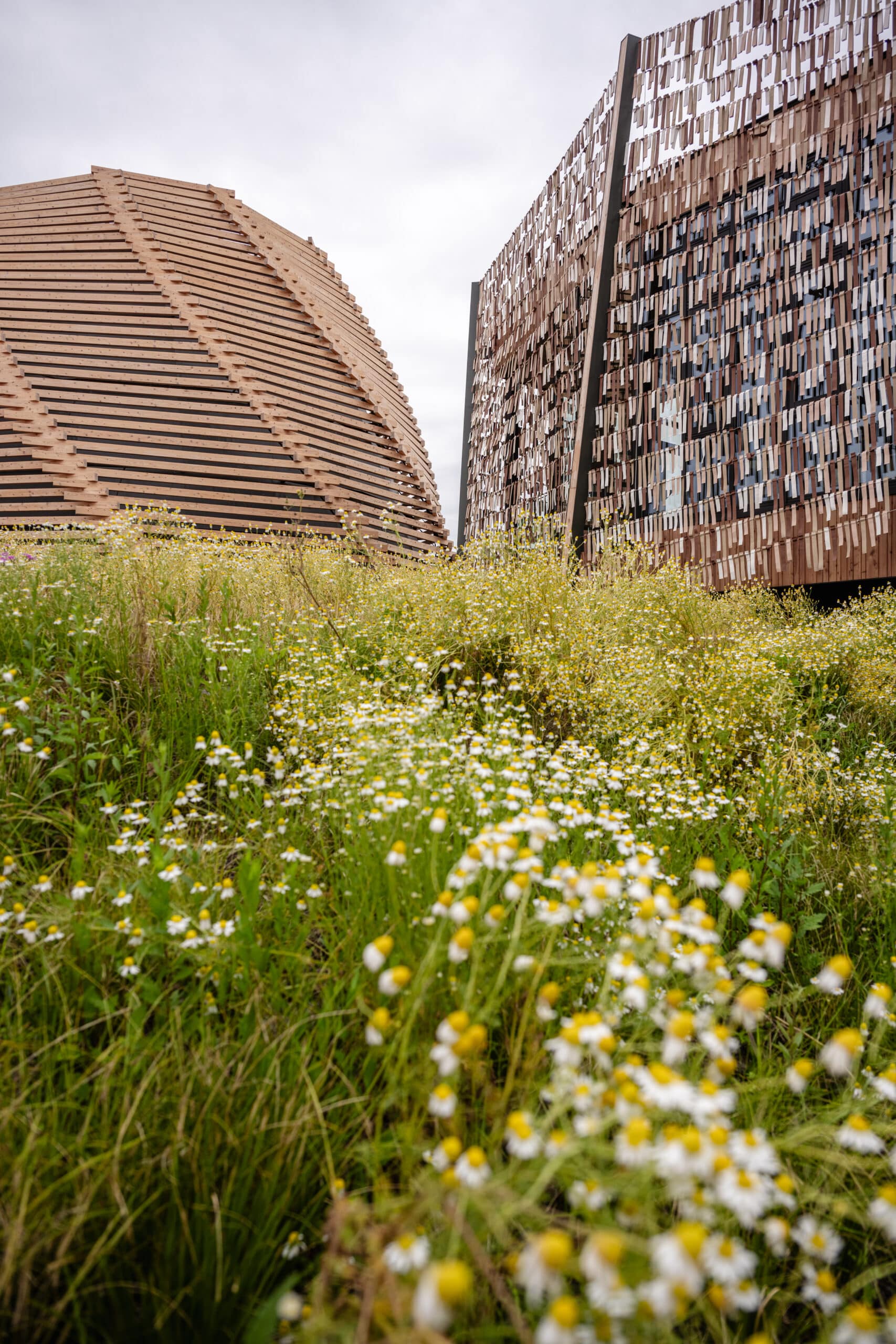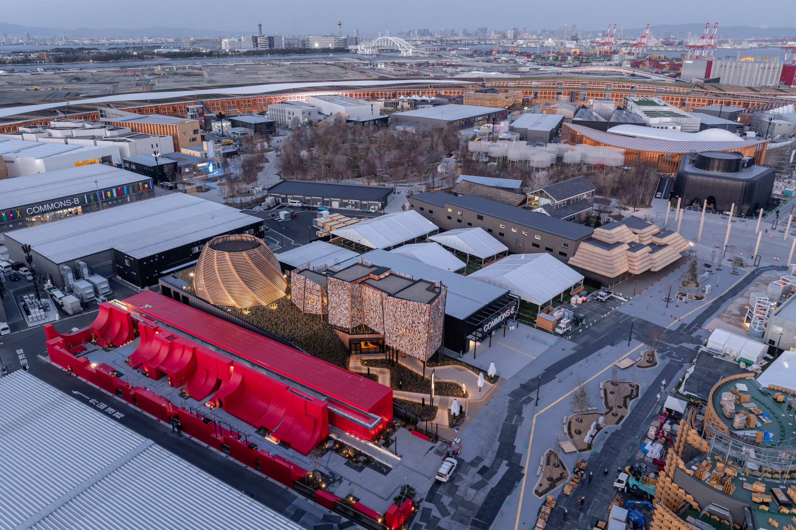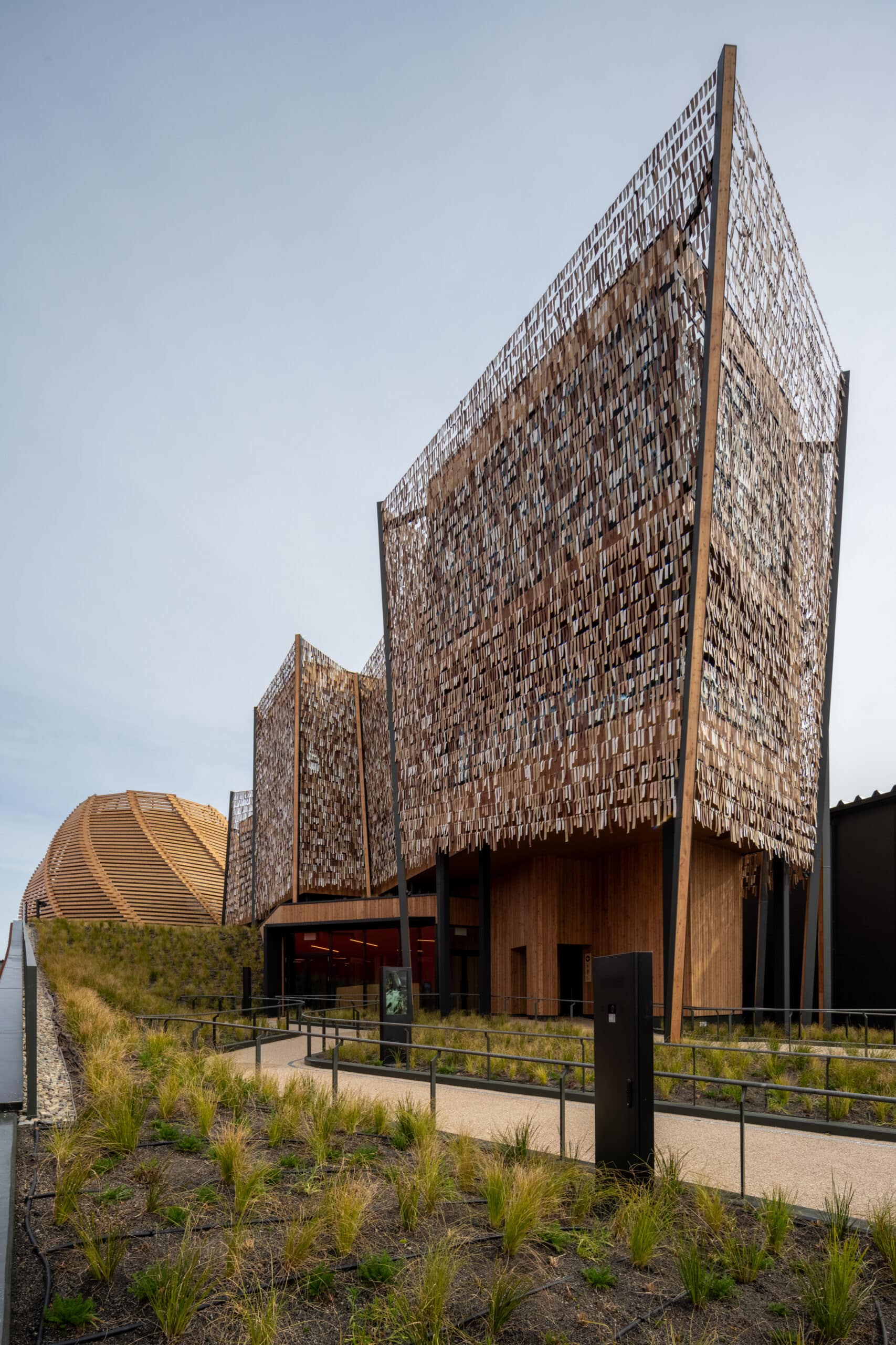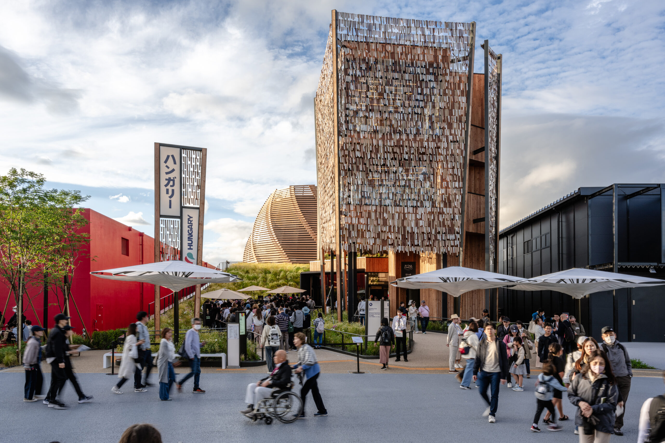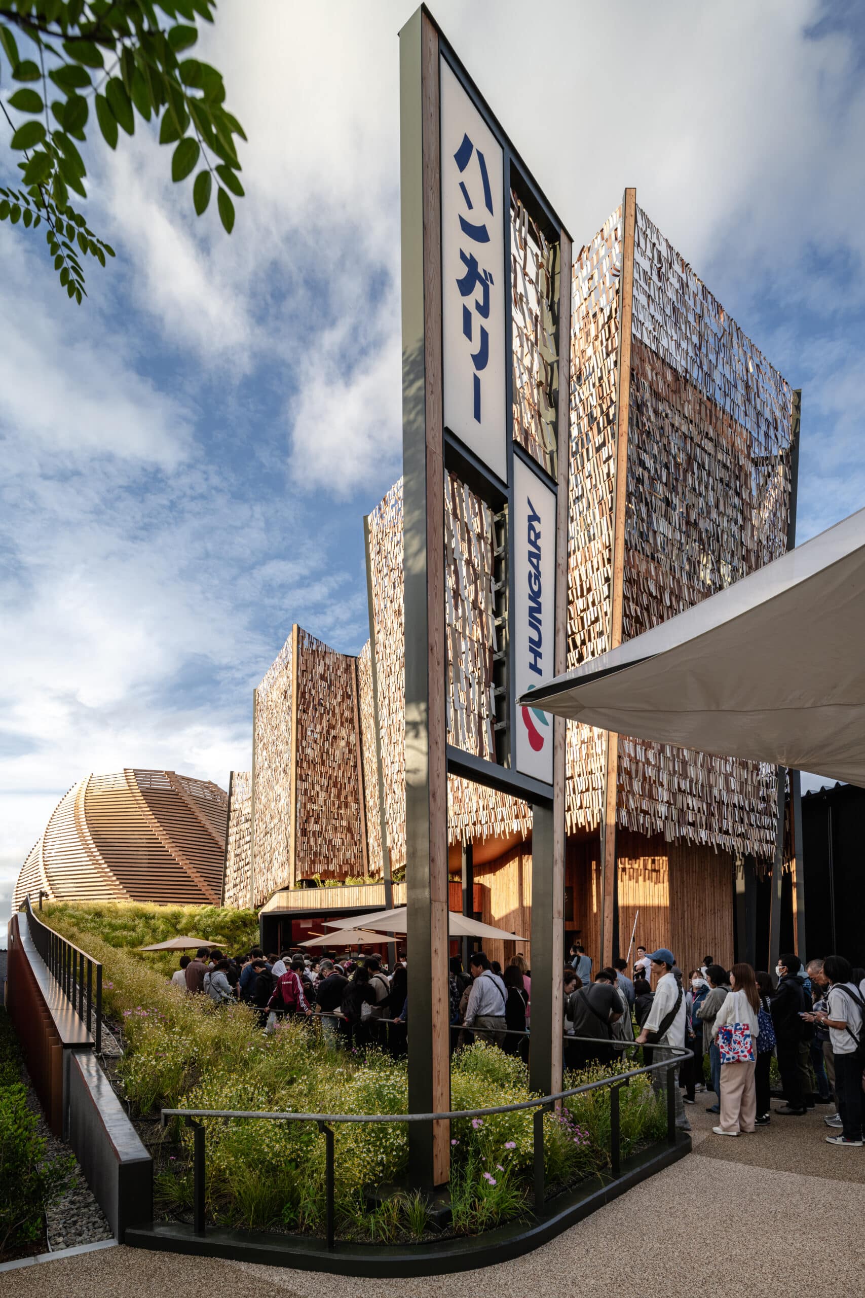 匈牙利馆呼应“为我们的生活设计未来社会”的核心主题,突出人与自然的关系,根植于文化遗产并强调可持续性。访客的抵达体验由唤起匈牙利草地意象的景观设计、乡土植物与自然气息共同营造;主要空间由象征性的“森林”和让人联想起草垛的木结构穹顶组织,穹顶内部设置沉浸式剧场——进入动线以风格化的“林间小径”和星空下的表演空间作为序曲。